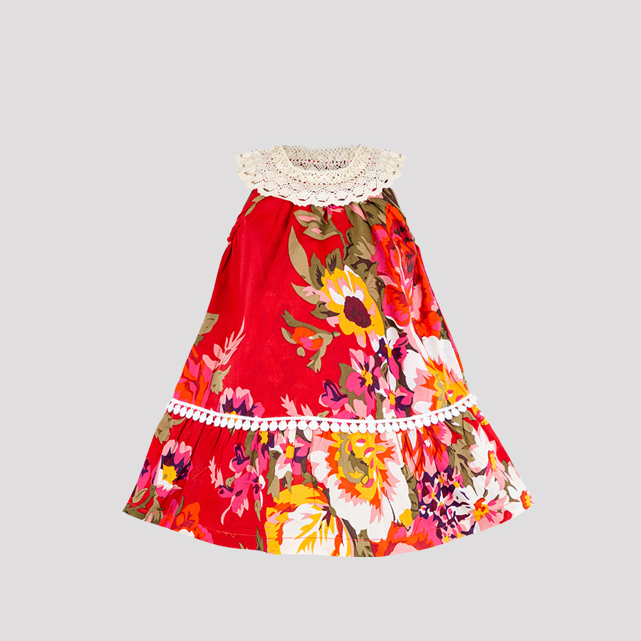 Abito in mussola di cotone stampa floreale con spallina in pizzo elasticizzato e balza.