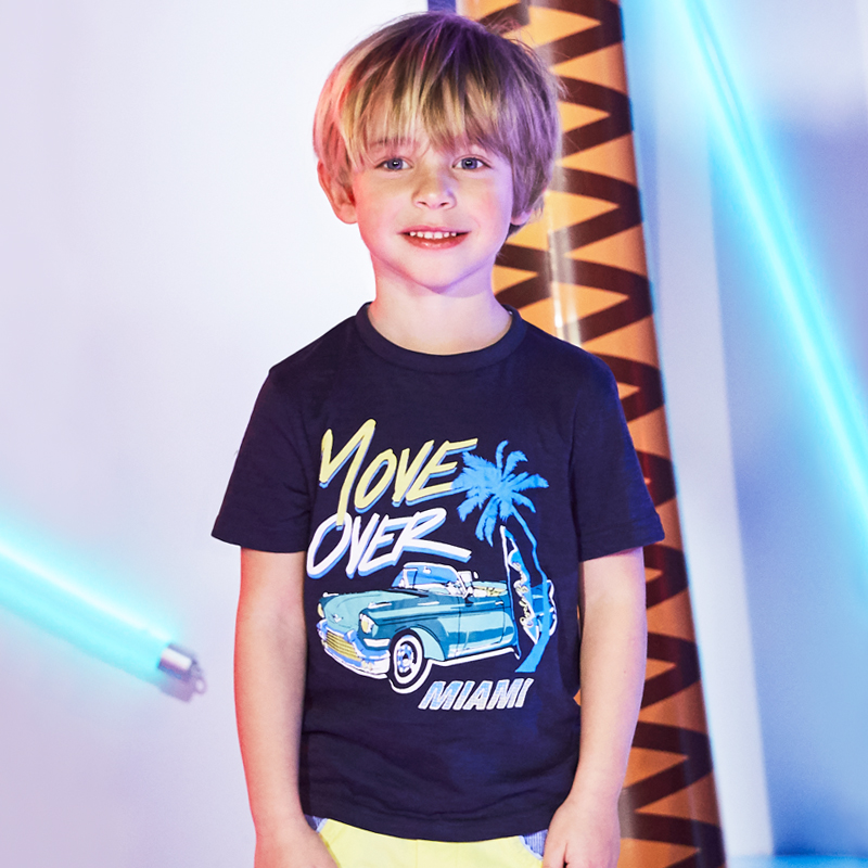 T-shirt manica corta girocollo in jersey fiammato 100% cotone, maxi stampa effetto fotografico